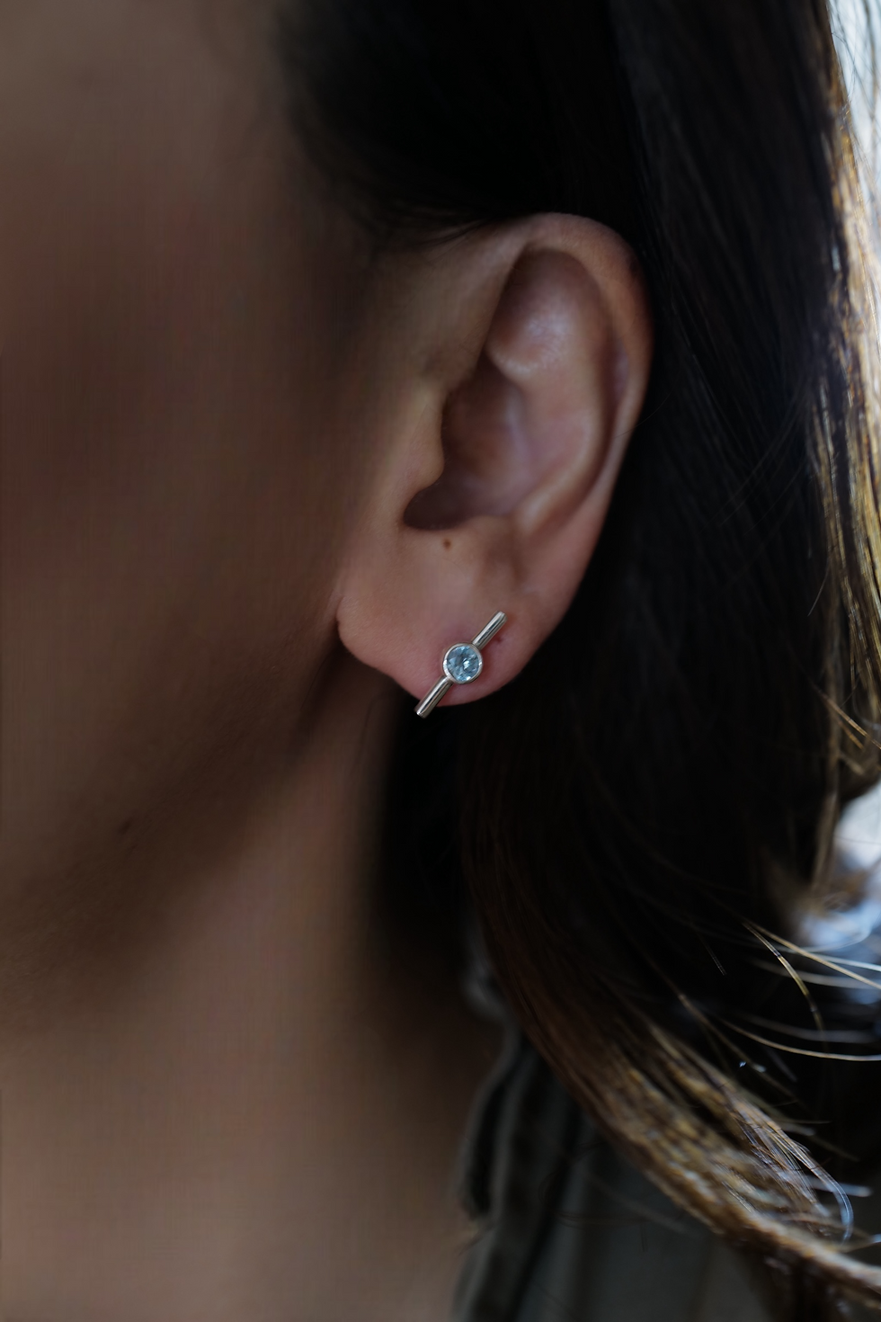 シャープな印象のスクエアフープに淡いピンクのモルガナイトがアクセントになったピアス。